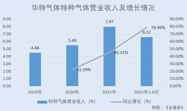 特种气体业务是华特气体主营业务的核心。2019-2021年及2022年1-6月,华特气体特种气体收入分别为 4.48亿元、5.48亿元、7.97亿元、6.57 亿元,2020-2021年及2022年1-6月分别同比增长22.39%、45.31%、78.96%。