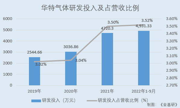 据东方财富choice数据,2019-2021年及2022年1-9月,华特气体的研发投入分别为2,544.66万元、3,036.86万元、4,720.30万元、4,931.33万元,占营业收入的比例分别为3.02%、3.04%、3.50%、3.52%。