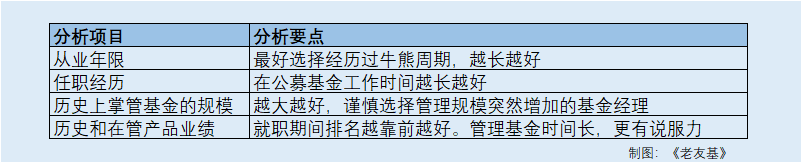 每个基金经理的履历背景、从业经历及投资风格都不一样,很难用简单的条件去筛选,最简单的办法是看其历史业绩,除此之外,可以根据下边所列出的不同分析要点来分析基金经理的历史业绩。