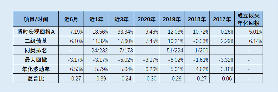 博时宏观回报债券成立于2010年7月27日,该基金资产配置中,固收方面以信用配置为组合提供收益安全垫,利率仓位调整灵活,进行积极的波段交易增厚收益;权益方面则风格稳定,深耕个股,偏向科技、消费,仓位中枢在10%,为组合主要上攻品种。