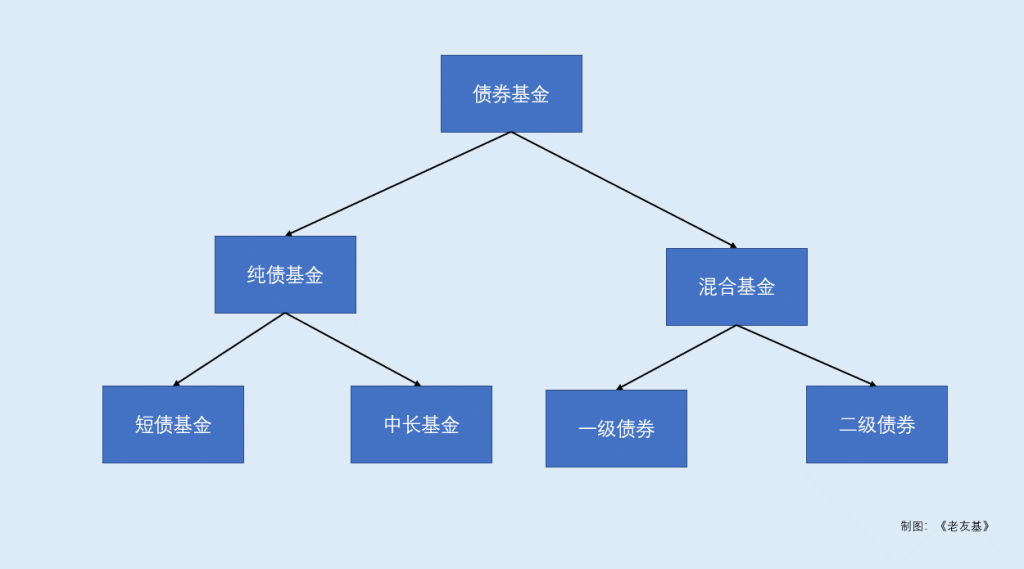债券基金的资产中,有80%以上投资于债券、存单等债权类资产,根据是否投资于股票可将债基分为纯债基金和混合债基。其中,纯债基金的久期是衡量利率风险的重要指标,因此,根据久期长短又可以将纯债基金分为短期纯债和中长期纯债基金。对于混合债基而言,我们则可以根据参与股市的方式,将其可分为一级债基和二级债基(可通过二级市场买卖参与)。