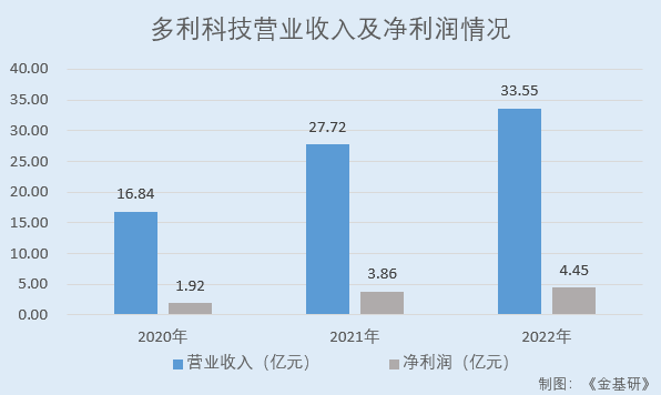 据招股书,2020-2022年,多利科技营业收入分别为16.84亿元、27.72亿元、33.55亿元,年均复合增长率达41.13%;净利润分别为1.92亿元、3.86亿元、4.45亿元,年均复合增长率达52.29%。