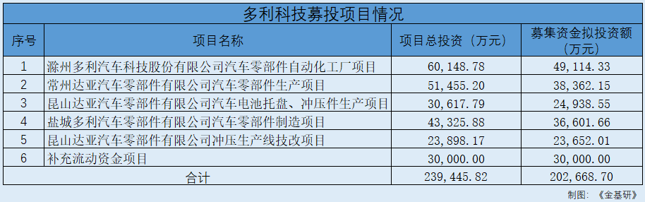 此番上市,多利科技拟募集资金20.27亿元分别投资“滁州多利汽车科技股份有限公司汽车零部件自动化工厂项目”、“常州达亚汽车零部件有限公司汽车零部件生产项目”、“昆山达亚汽车零部件有限公司汽车电池托盘、冲压件生产项目”、“盐城多利汽车零部件有限公司汽车零部件制造项目”、“昆山达亚汽车零部件有限公司冲压生产线技改项目”及“补充流动资金项目”。