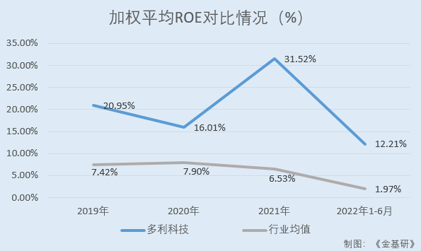 经金基研计算,2019-2021年及2022年1-6月,上述9家多利科技同行业可比公司的加权平均ROE均值分别为7.42%、7.90%、6.53%、1.97%。