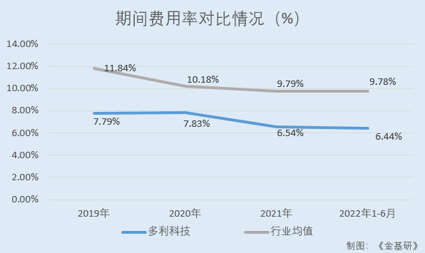 据东方财富choice数据,2019-2021年及2022年1-6月,多利科技的期间费用率分别为7.79%、7.83%、6.54%、6.44%。同期,多利科技同行业可比公司长华股份、博俊科技、华达科技、祥鑫科技、无锡振华、英利汽车、金鸿顺、联明股份、常青股份的期间费用率均值分别为11.84%、10.18%、9.79%、9.78%。