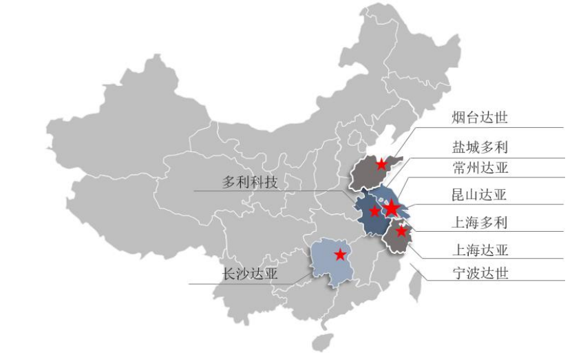 伴随着国内汽车工业的快速发展和整车制造商在全国生产基地的布局,多利科技出于与客户同步开发、向客户及时供货并最大限度降低产品运输成本等考虑,采取紧贴汽车产业集群建立生产基地的战略,先后在上海安亭、江苏昆山、安徽滁州、山东烟台、浙江宁波、湖南长沙、江苏常州、上海临港、江苏盐城、浙江杭州和安徽六安进行配套布点。