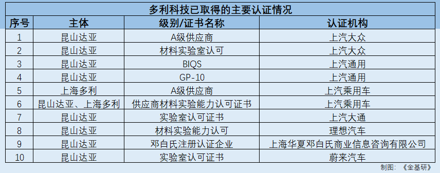 此外,多利科技通过了上汽通用BIQS、上汽大众Formel-Q等客户的质量过程审核,连续数年在上汽大众、上汽乘用车质量能力过程审核中被评级为A级。截至2023年2月6日,多利科技已经获得了上汽大众、上汽通用、上汽乘用车、上汽大通、理想汽车、蔚来汽车等整车制造商的相关认证。