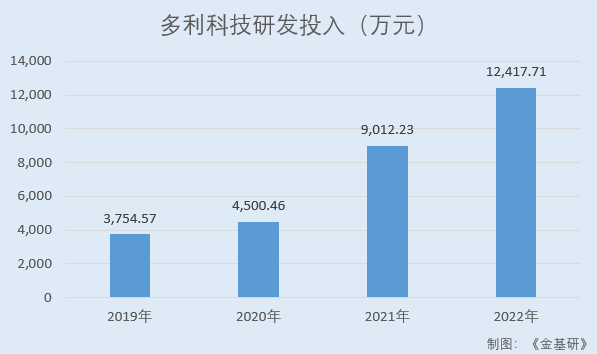 近年来,多利科技研发投入呈逐年增长趋势。2019-2022年,多利科技研发投入分别为3,754.57万元、4,500.46万元、9,012.23万元、12,417.71万元,年均复合增长率达48.99%。
